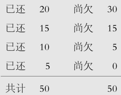“我的朋友,”撒米尔开口道,“我只需要用几句话就可以解释这个现象。因为债务的余额,其实和整笔债的数字没有任何关系。我们不妨先假定50个第纳尔是分三期偿还—第一期还10,第二期还5,第三期35。因此账单如下,连同余额: