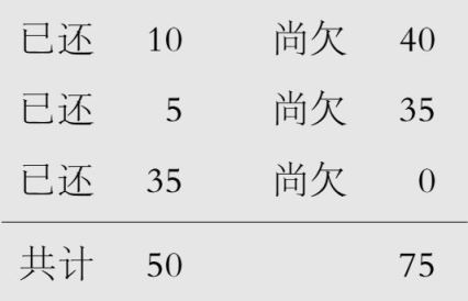 这个例子里的第一栏总和仍是50,可是债务余额栏总和却如你所见,变成75了。其实,还可以是80、99、100、260、800,任何数字都有可能。完全只是出于巧合,才刚好也是50,就像第一位老爷的例子那样。或是像第二位商人那样,变成51。”