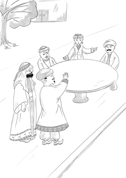 “各位的账单,连同用餐,一共是30第纳尔。”店主答道。纳瑟耳想请客,可是大马士革来的三位哪里能肯,于是又起了一场小讨论,加上彼此恭维互相感谢的言辞,每个人都在同时发话。最后终于决定:纳瑟耳是客,一毛都不该付;那三位则每人出10个第纳尔。于是30个第纳尔便递给店主手下一名苏丹奴隶交付他的主人。一会儿之后,只见奴隶返回说道:“敝主人说他算错了。账单应该是25个第纳尔,所以吩咐我将这5第纳尔还给各位。”