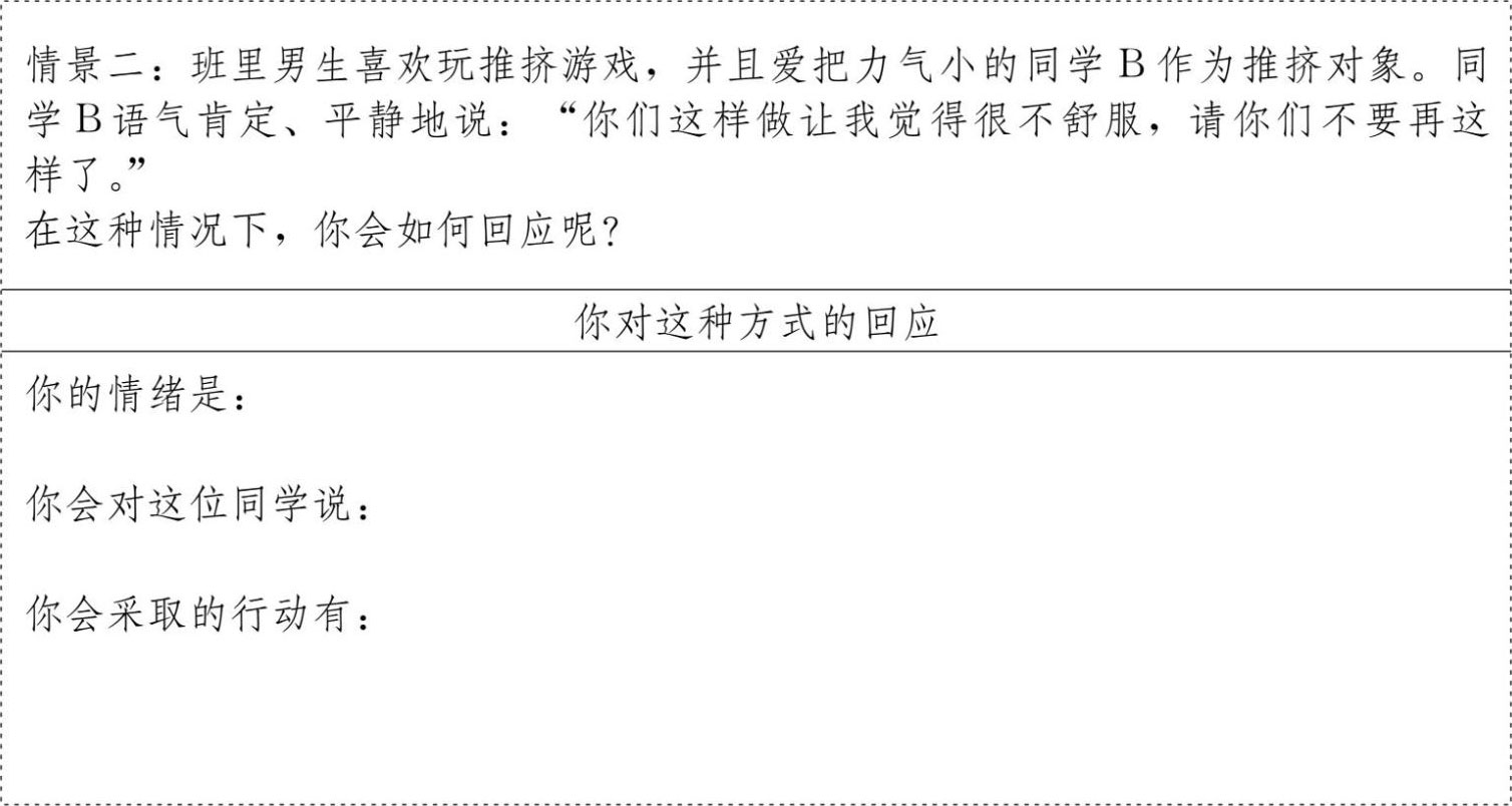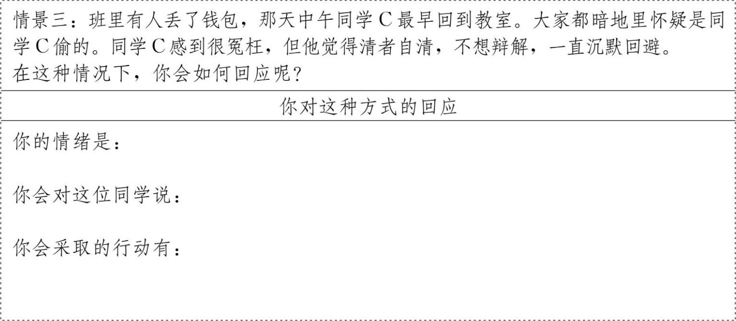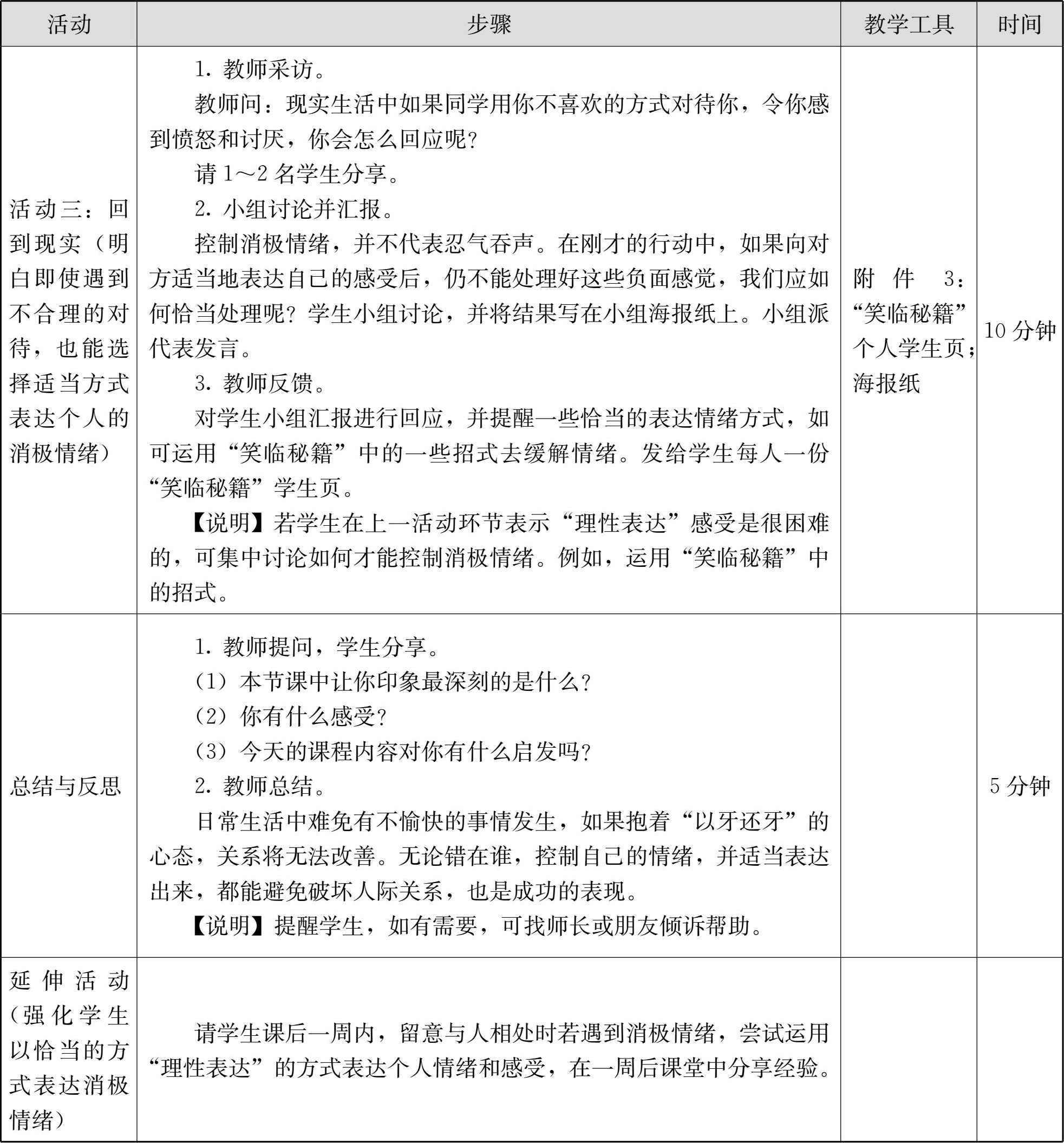4.【活动三:回到现实】让学生明白即使遇到不合理的对待,也能选择适当方式表达个人的消极情绪。