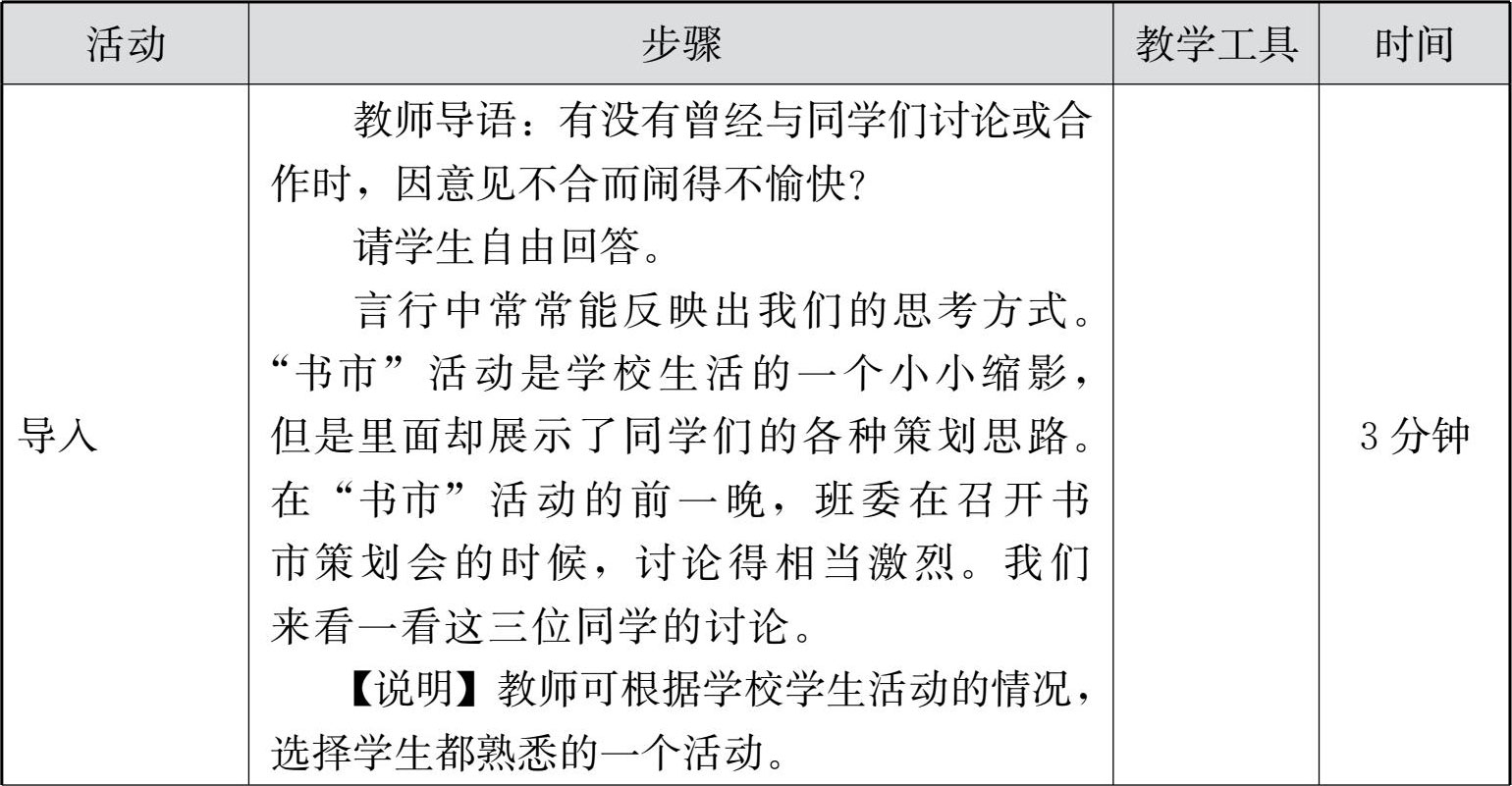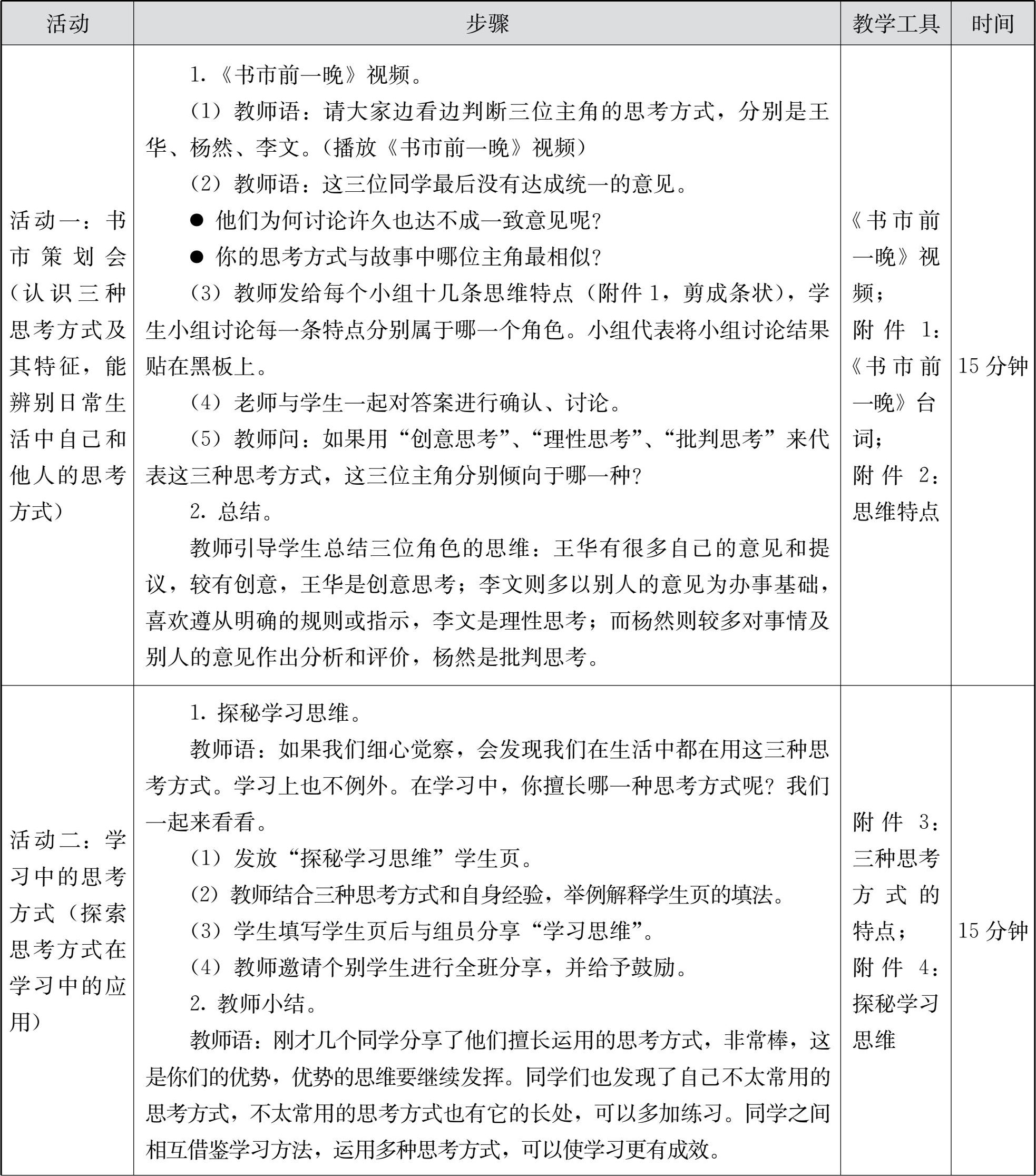 2.【活动一:书市策划会】认识三种思考方式,能辨别日常生活中自己和他人的思考方式。