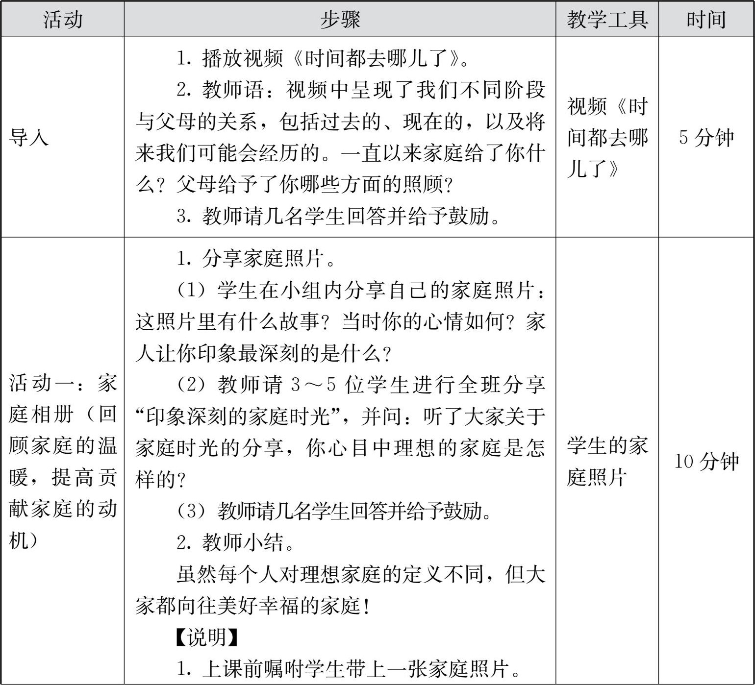 2.【活动一:家庭相册】学生分享家庭生活中印象深刻的时光,回顾家庭的温暖,激发学生为家庭做更多积极贡献的动机。