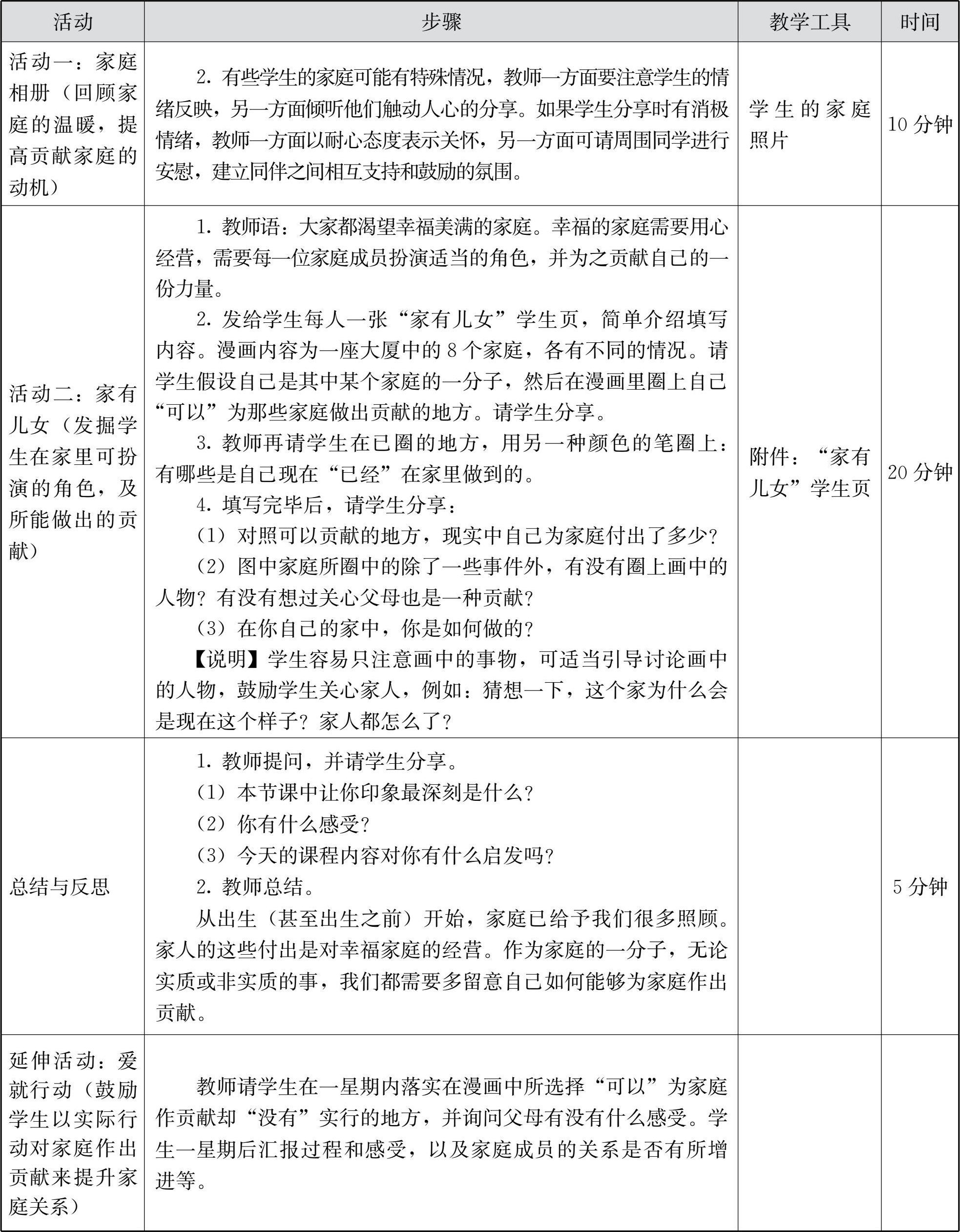 5.【延伸活动:爱就行动】鼓励学生以实际行动对家庭作出贡献来提升家庭关系。