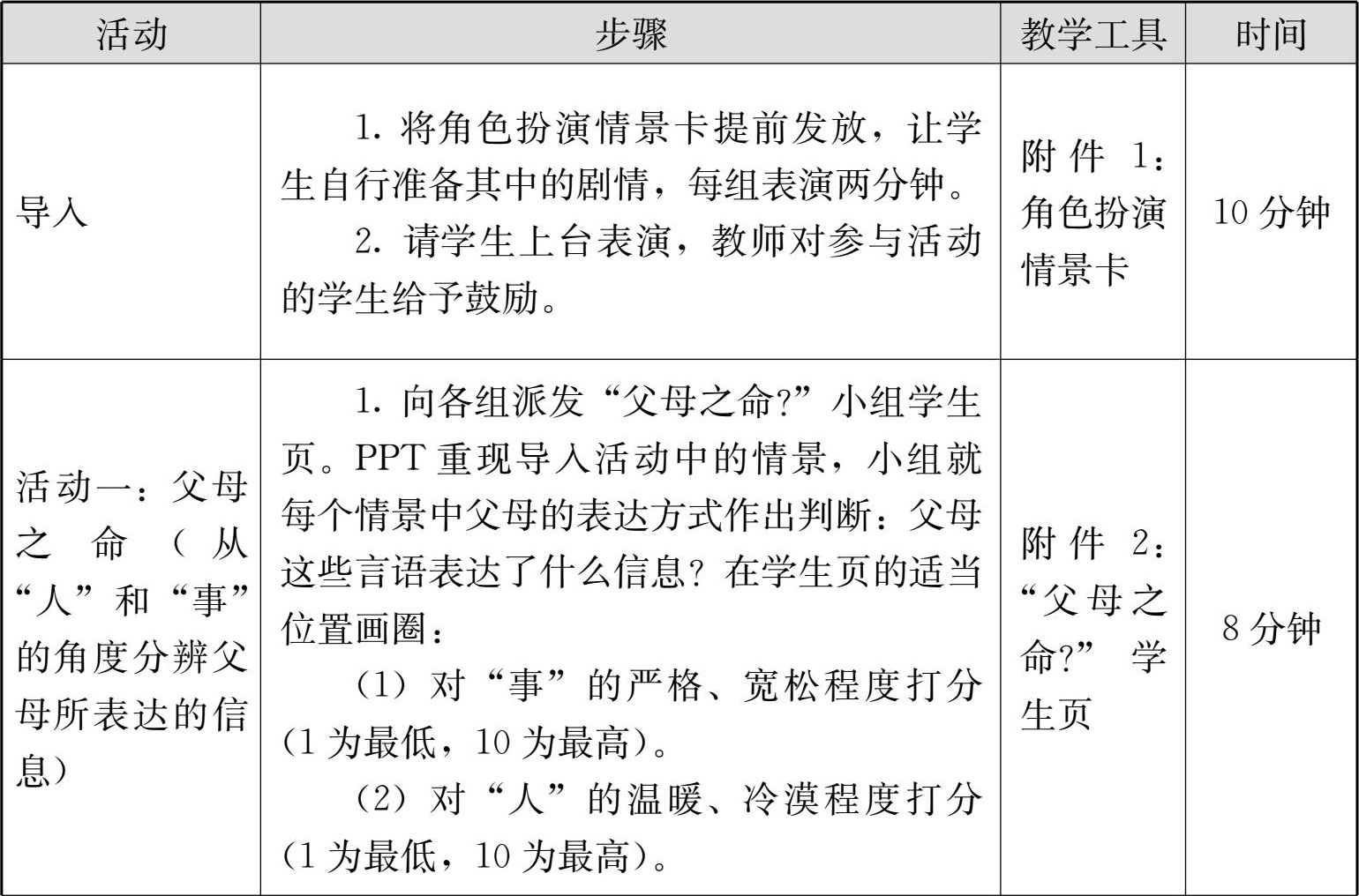 2.【活动一:父母之命】学生通过讨论表演中父母的言语,从“人”和“事”的角度分辨父母所表达的信息。