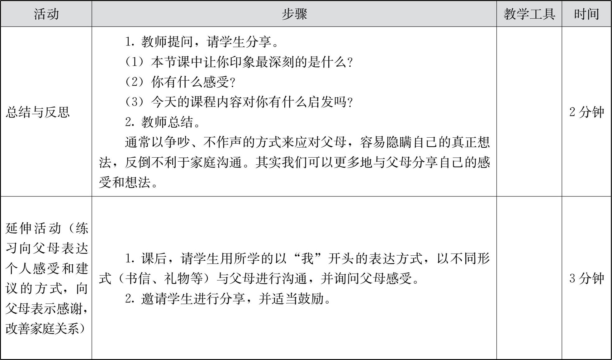 5.【总结与反思】回顾本课与父母表达方式相关的内容,将恰当回应父母的方式内化,并应用于实际。