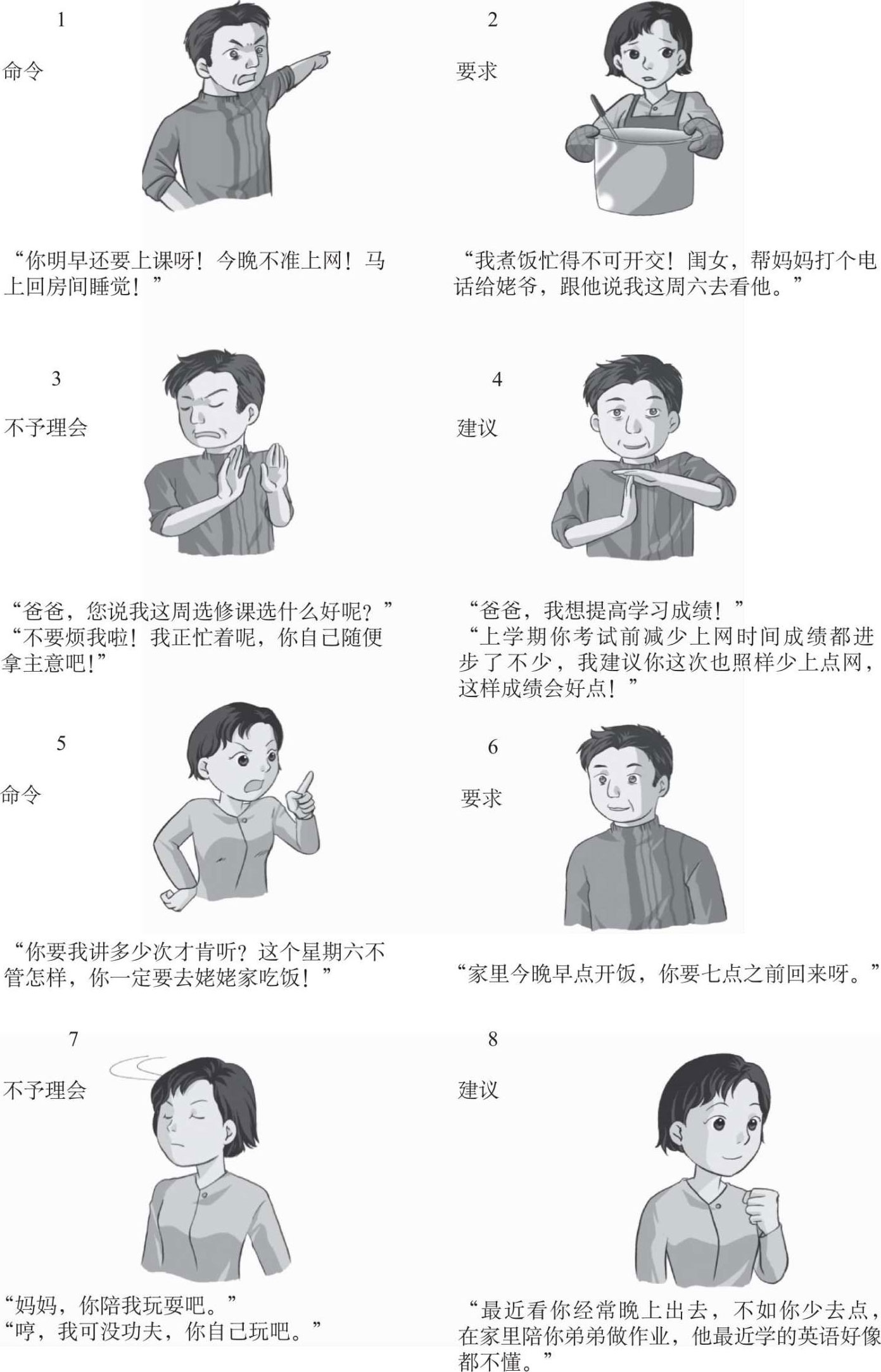 1.通过讨论父母的言语,认识“命令”、“要求”、“不予理会”、“建议”四种方式的差异及背后传递的信息。