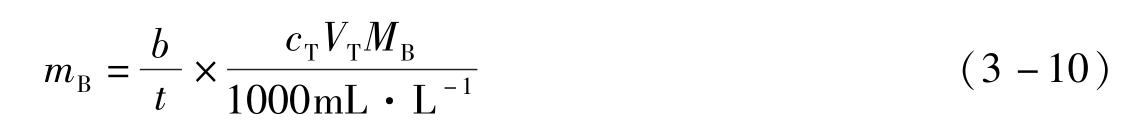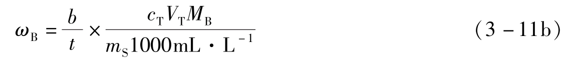式3-5是滴定分析中滴定液T与被测物质B之间化学计量的基本关系式,根据实际情况,可衍生出不同的计算表达式。