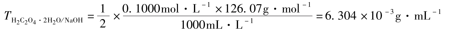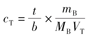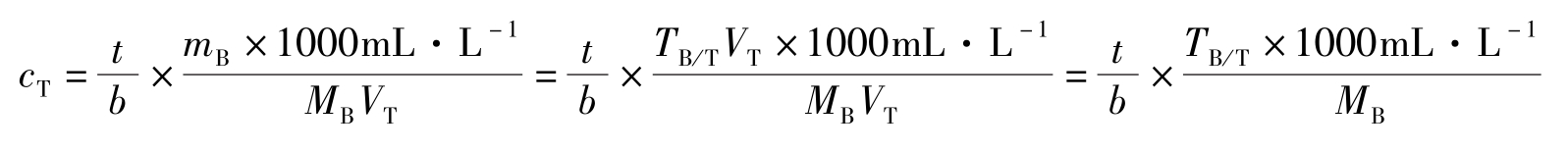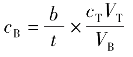 式中,下标T、B分别表示滴定液中的溶质、被测物质的化学式。 V T 表示滴定物质B所消耗的滴定液的体积,单位为mL; T B/T 表示滴定液滴定物质B时的滴定度; m B 为被测物质B的质量,单位为g或mg。
