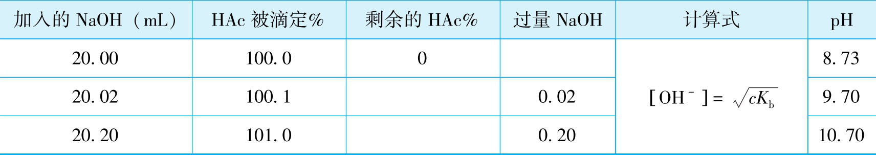 (3)化学计量点时 NaOH与HAc全部反应,溶液组成为NaAc。由于Ac - 为弱碱,因此溶液pH按一元弱碱溶液pH的最简式进行计算: