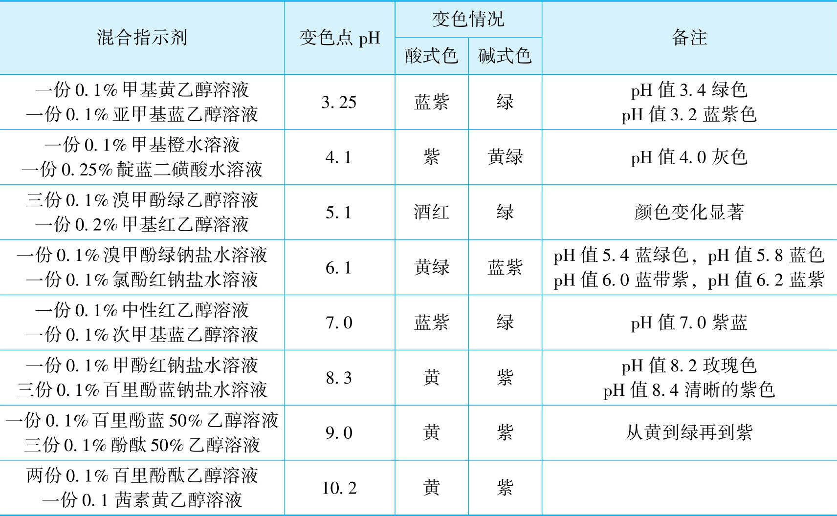 混合指示剂具有变色范围窄、变色敏锐的特点。通常可分为两类,一类是在某种指示剂中加入一种惰性染料,因颜色互补使变色敏锐。例如,由甲基橙和靛蓝组成的混合指示剂,靛蓝的颜色不随溶液的pH改变而变化,只作甲基橙的蓝色背景,在滴定过程中随溶液pH的变化而发生如下颜色变化。