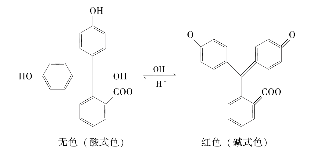 当溶液酸度增大时,酚酞主要以酸式结构存在,溶液无色;当溶液酸度减小时,酚酞主要以碱式结构(醌型)存在,溶液呈红色。