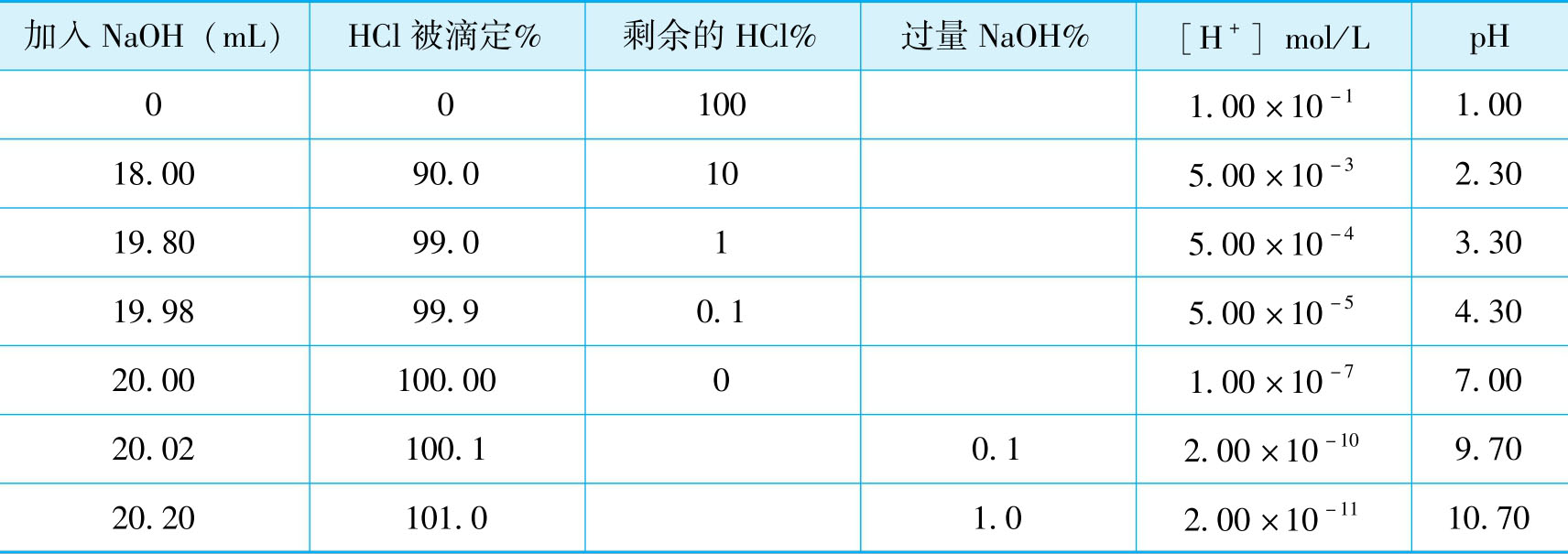 现以浓度为0.1000mol·L -1 的NaOH滴定20mL 0.1000mol·L -1 的HCl为例,讨论滴定过程中溶液pH的变化情况。滴定过程可分为四个阶段: