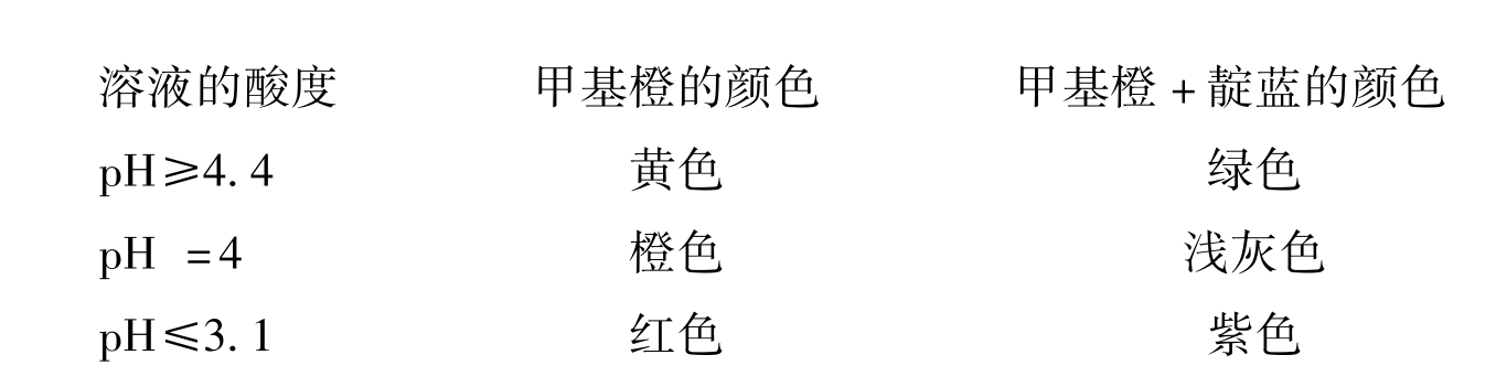 可见,甲基橙由黄(红)色变到红(黄)色时,有一过渡色橙色较难辨认;而甲基橙-靛蓝混合指示剂,由绿色(或紫色)变化为浅灰色,再到紫色(绿色),中间呈近于无色的浅灰色,变色范围窄,终点颜色变化非常敏锐。