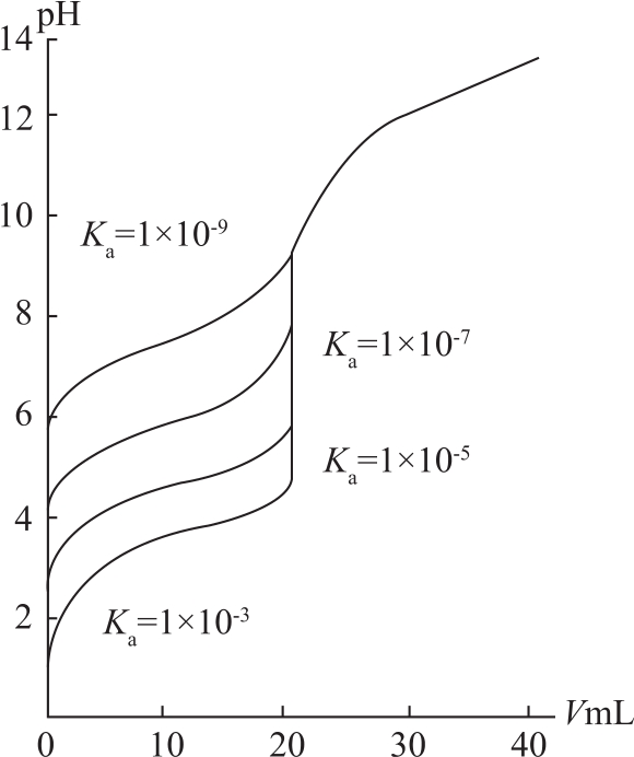 1.弱酸(弱碱)的强度 用0.1000mol·L -1 的NaOH滴定不同强度的0.1000mol·L -1 的一元弱酸,绘制滴定曲线如图4-4所示。当弱酸浓度一定时, K a 越大,滴定突跃范围越大,反之越小。当 K a <10 -9 时,即使弱酸浓度为1mol·L -1 ,也无明显的突跃。