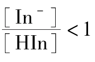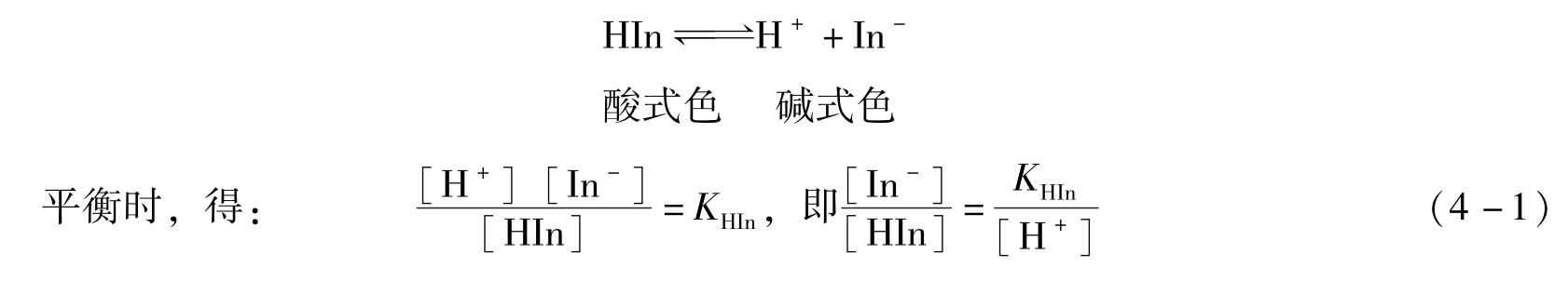现以弱酸指示剂(HIn)为例,说明指示剂的变色与溶液中pH之间的数量关系。HIn在溶液中存在下列解离平衡: