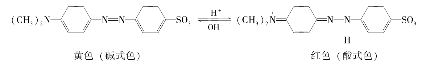 例如,甲基橙是一种双色指示剂,其结构为有机弱碱。在溶液中的解离平衡及相应的颜色变化如下: