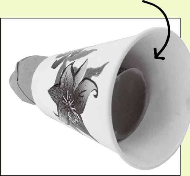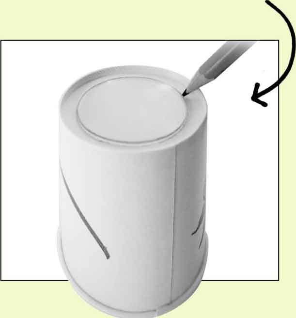 5.请你的成人助手在纸杯底部剪出一个洞,略大于你刚刚描摹的那个圆圈。将纸筒插入纸杯中,检查纸筒是否能够在洞中来回滑动。如果不能,将洞再稍微剪大一些。