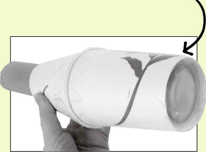 10.现在,把两个杯子的杯口拼在一起,然后用胶带把它们粘起来。凸透镜在一端,塑料圆盘在中间的位置,而纸筒的开口在另一端。