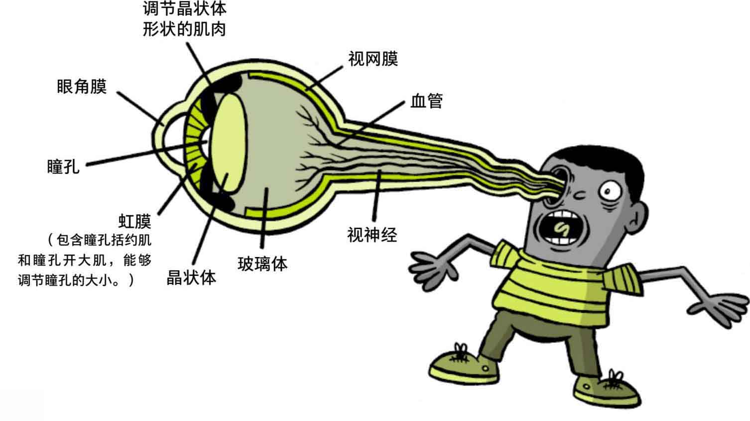 在晶状体之后视网膜之前的空间,存在着一种透明的像果冻一样的物质,叫作“玻璃体”。玻璃体使你的眼睛呈现出了球形。视网膜位于你眼球的后部。在你的眼球电影院里,视网膜基本上就相当于那个巨大的弧形电影屏幕。视网膜由能够探测光线的特殊细胞组成,这些细胞将光线转换成电子信号,电子信号经由你的视觉神经进入你大脑中负责视觉处理的区域。物体通过眼睛在视网膜上的成像是倒立的,但是你聪明的脑细胞能够将该成像翻转过来。如果整个世界看起来都是颠倒的,我们可能就很难四处闲逛了!