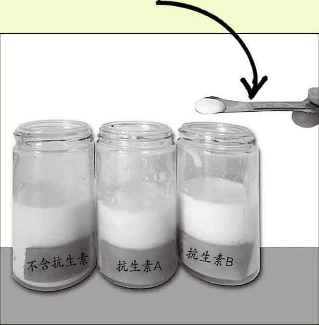 5.如果你还准备测试另一种抗生素,请重复上述步骤。但是,请另取一个干净的勺子舀出抗生素,然后将其置于标有“抗生素B”的瓶子中。
