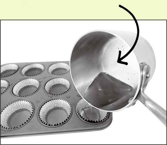 6.将烘焙用的铝箔纸杯置于烤盘中。如果铝箔纸杯中内置了小小的纸质衬片,请将其取出,留着以后用来制作青春痘纸杯蛋糕。