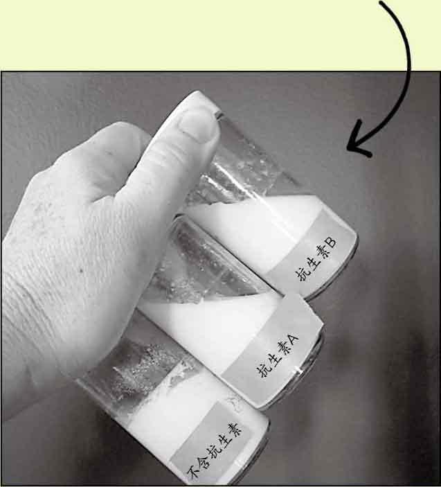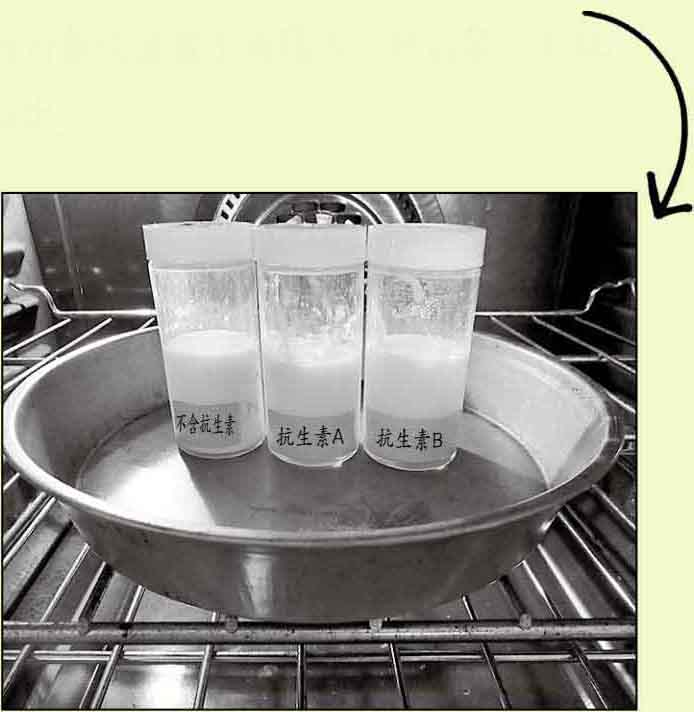 你大概已经注意到了,标有“不含抗生素”的瓶子内的牛奶已经变得浓厚而黏稠。这是因为,当你在牛奶中加入一团酸奶后,就等于在牛奶中加入了一些有益且活跃的细菌。它们在你的瓶子中找到了一个舒适的家,然后开始大量地繁殖(衍生出更多的细菌)。接着,它们继续忙碌地制造大量的乳酸,从而使牛奶变得浓厚而柔滑,新的酸奶也就形成了。你加入在其他瓶子中的抗生素杀灭了酸奶中的乳酸菌,于是,乳酸没有形成,所以牛奶依旧还是牛奶。