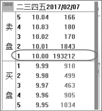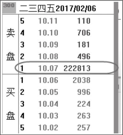 图1-2和图1-3分别为二三四五(002195)2017年2月6日和2017年2月7日收盘时的挂单情况。这两日,该股股价盘中振幅较小,运行平稳,盘中的挂单情况也算正常,但是在收盘时,却出现了这种明显的异常,卖一的数量远远大于买盘数量。看着这样的收盘情形,我们直观的感觉就是此股压盘太重,未来走势是易跌难涨。然而,实际情况恰好相反。