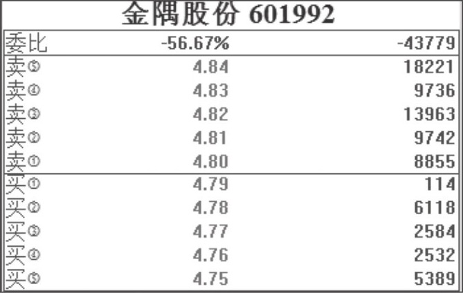 例如,在买①处为“4.79,114”,这代表当前这一时刻,在4.79元价位处共有114手的委托买单(指已委托申报买入、但仍未成交的),随着交易的进行,买卖单的价格及数量都会实时变化。