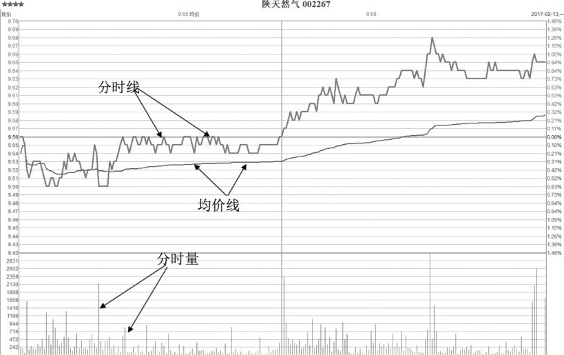 在分时图中,分时线反映着价格的实时走势。分时线下方的一条波动较为缓和的曲线为均价线。图1-5标示了分时线、均价线和分时量。