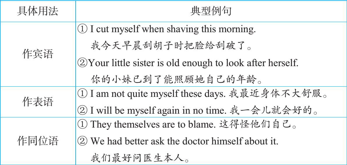 反身代词在高考中的基本用法参见下表: