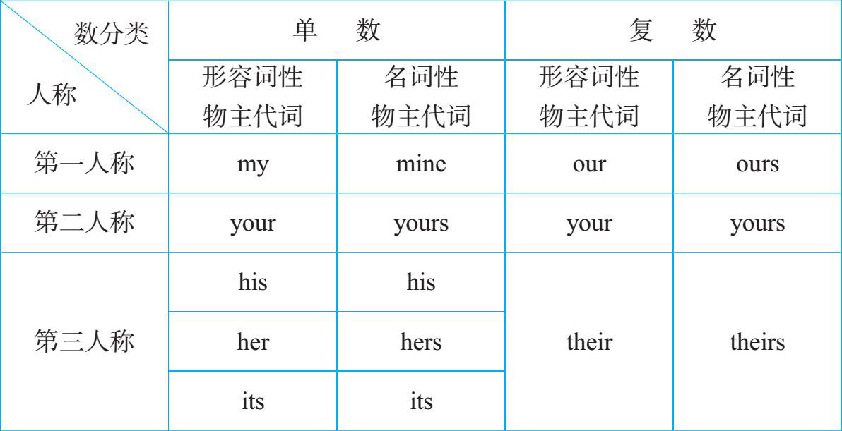 物主代词分形容词性和名词性两种,其具体形式参见如下总结。