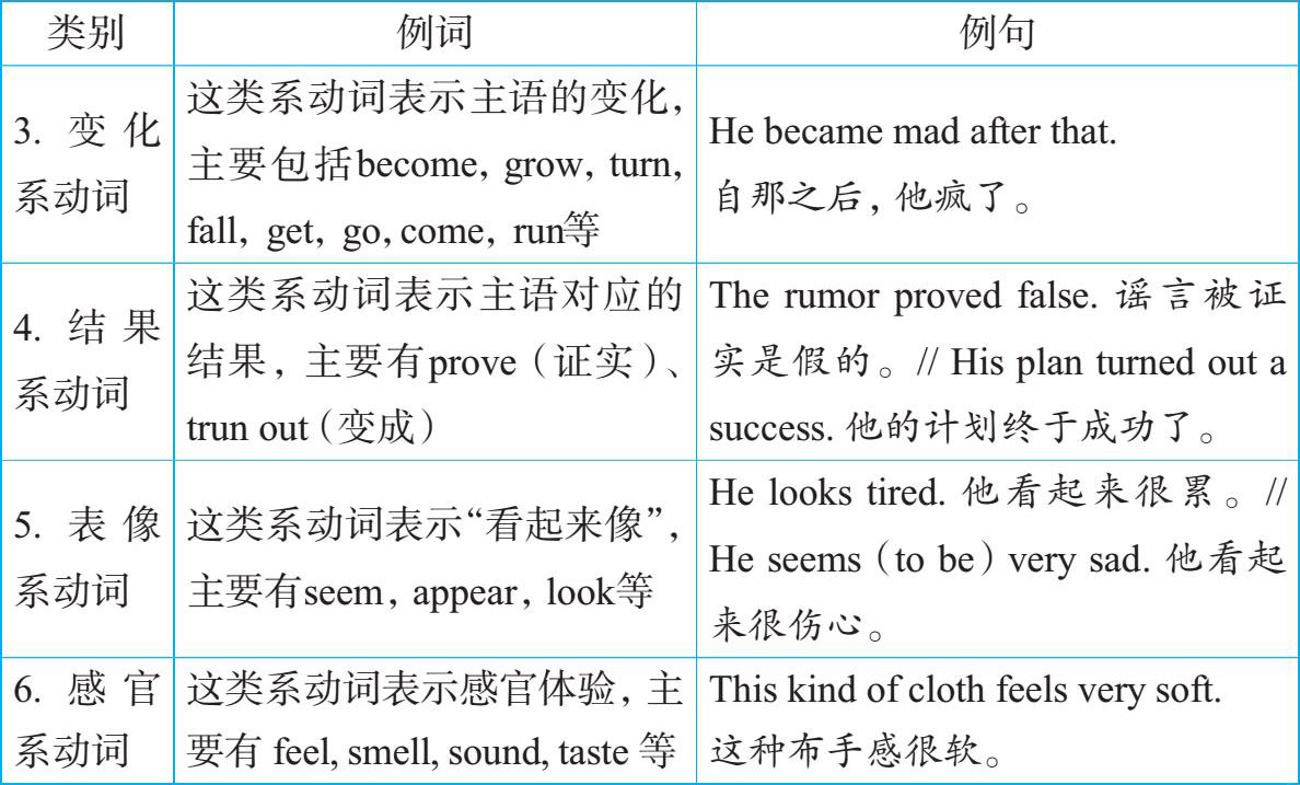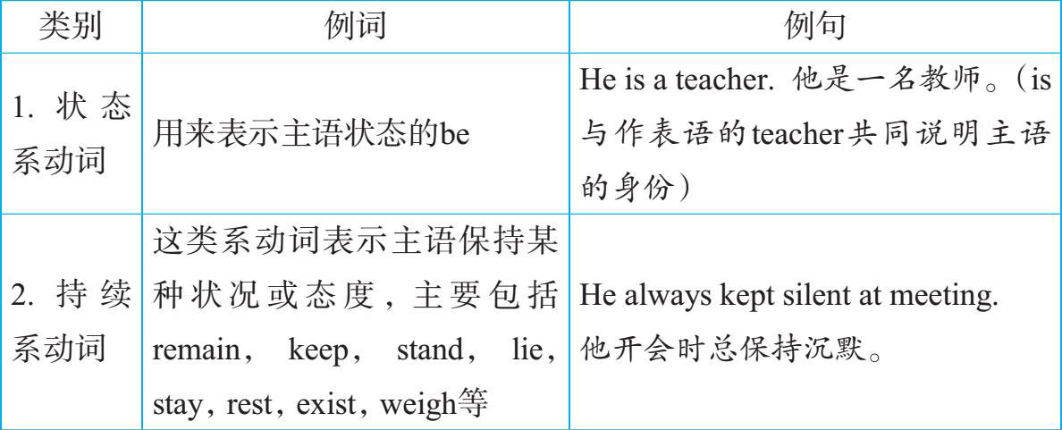 系动词是连接主语和表语(充当表语的词类主要是形容词和名词)的动词,系动词跟情态动词一样本身具有词义,但系动词不能单独用作谓语,后边必须跟表语(简略答语等特殊情况除外)。下表是对高考中有可能出现的系动词及其用法的总结: