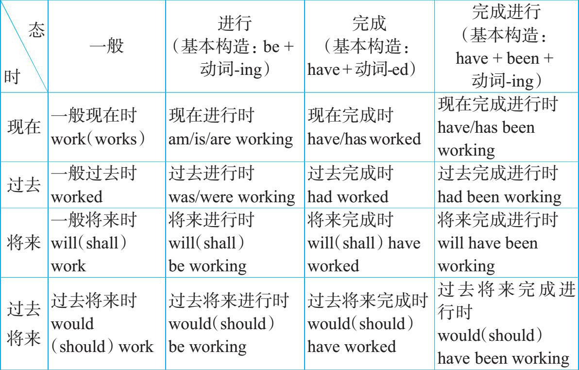 谓语动词用来表示动作发生时间、存在状态的各种形式称为时态。英语中存在十六种时态,下表以动词work为例进行介绍: