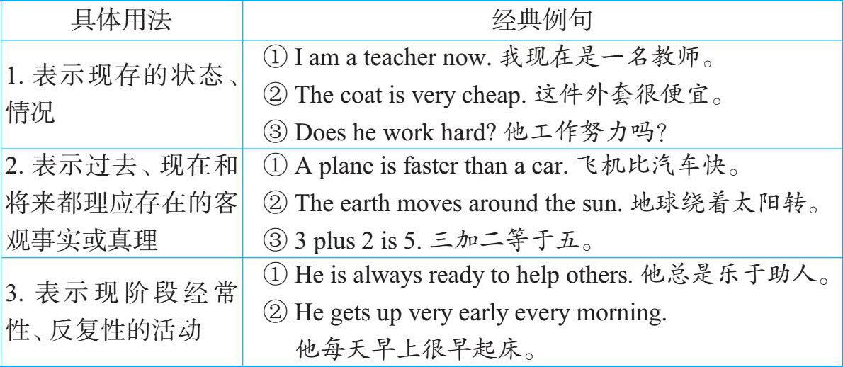 一般现在时多由动词原形来表示,主语是第三人称单数时应在动词原形后加-s或-es词尾。要注意表示一般现在时的两类不规则的动词:实义动词have有have和has两个形式,主语是第三人称单数时用has,其余情况用have;be有am,is,are三种形式,主语是第一人称单数用am,主语是第三人称单数用is,其余情况下用are。