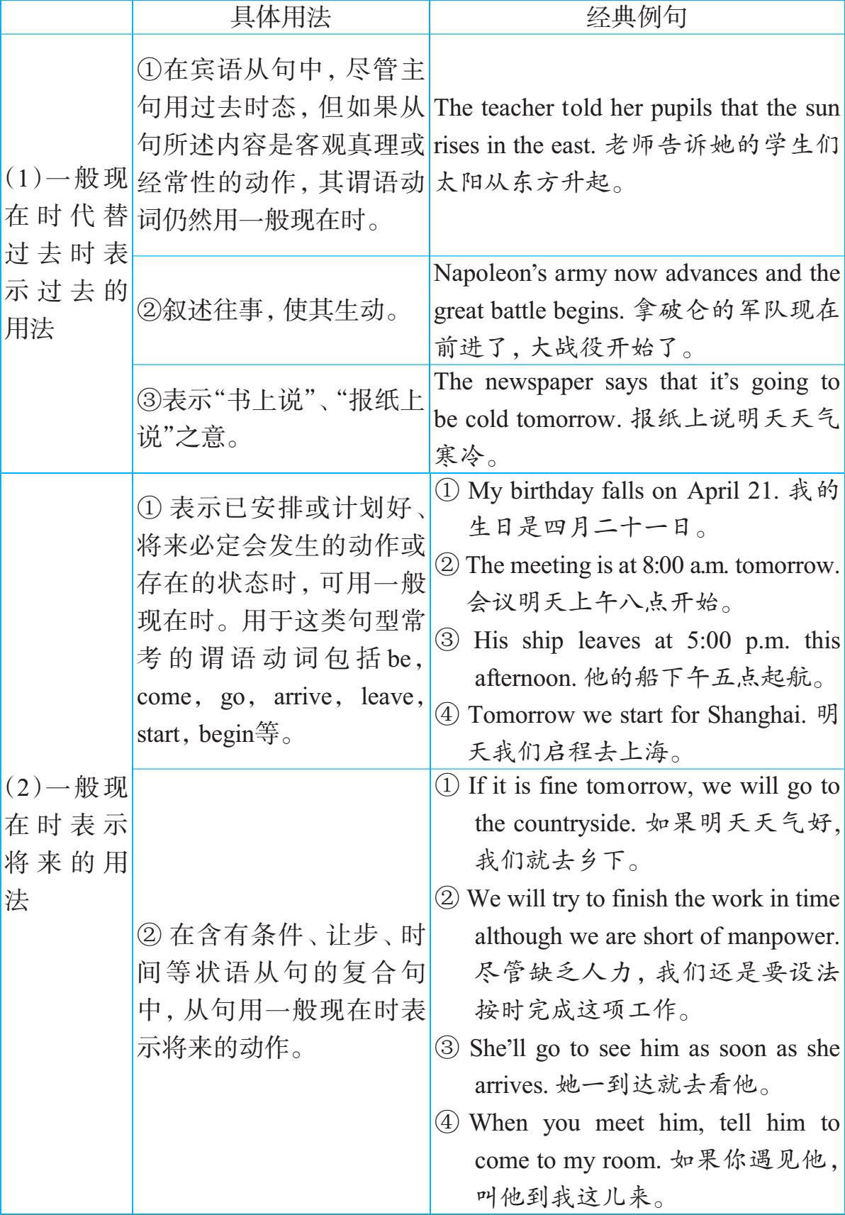 4.用某些瞬间动词如go, come, leave, start, begin, give, take等的一般现在时或者现在进行时的形式表示即将要发生的动作。例如:We start at six and arrive at the station at seven. 我们六点出发,七点到达车站。// The train is leaving. 火车就要开了。// Our manager is giving a report this afternoon. 我们的经理今天下午要作报告。