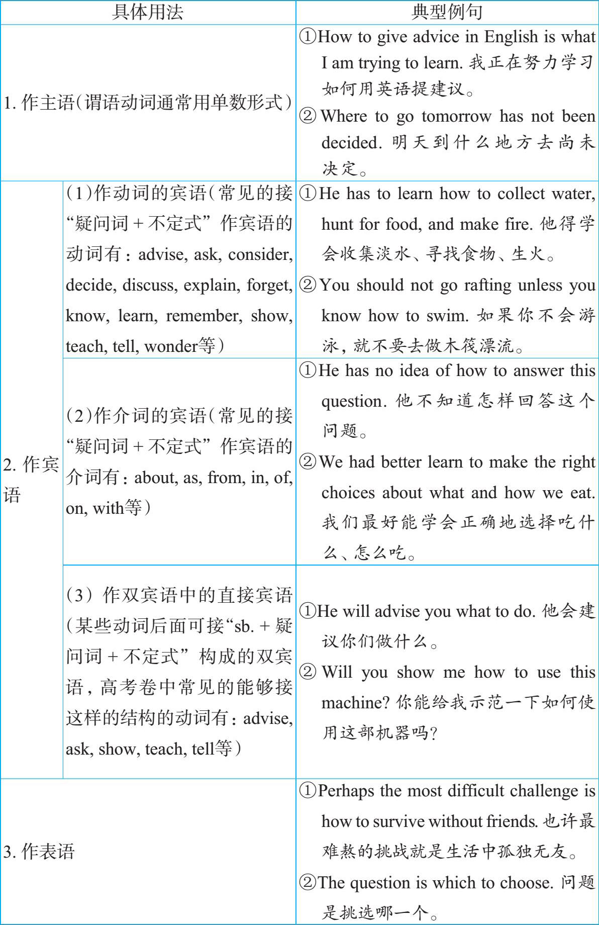“疑问词+不定式”在高考中的具体用法请参见下表的总结: