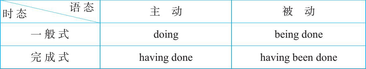 动名词有一般式和完成式两种形式,其中及物动词又分主动式和被动式,下表以动词do为例进行介绍: