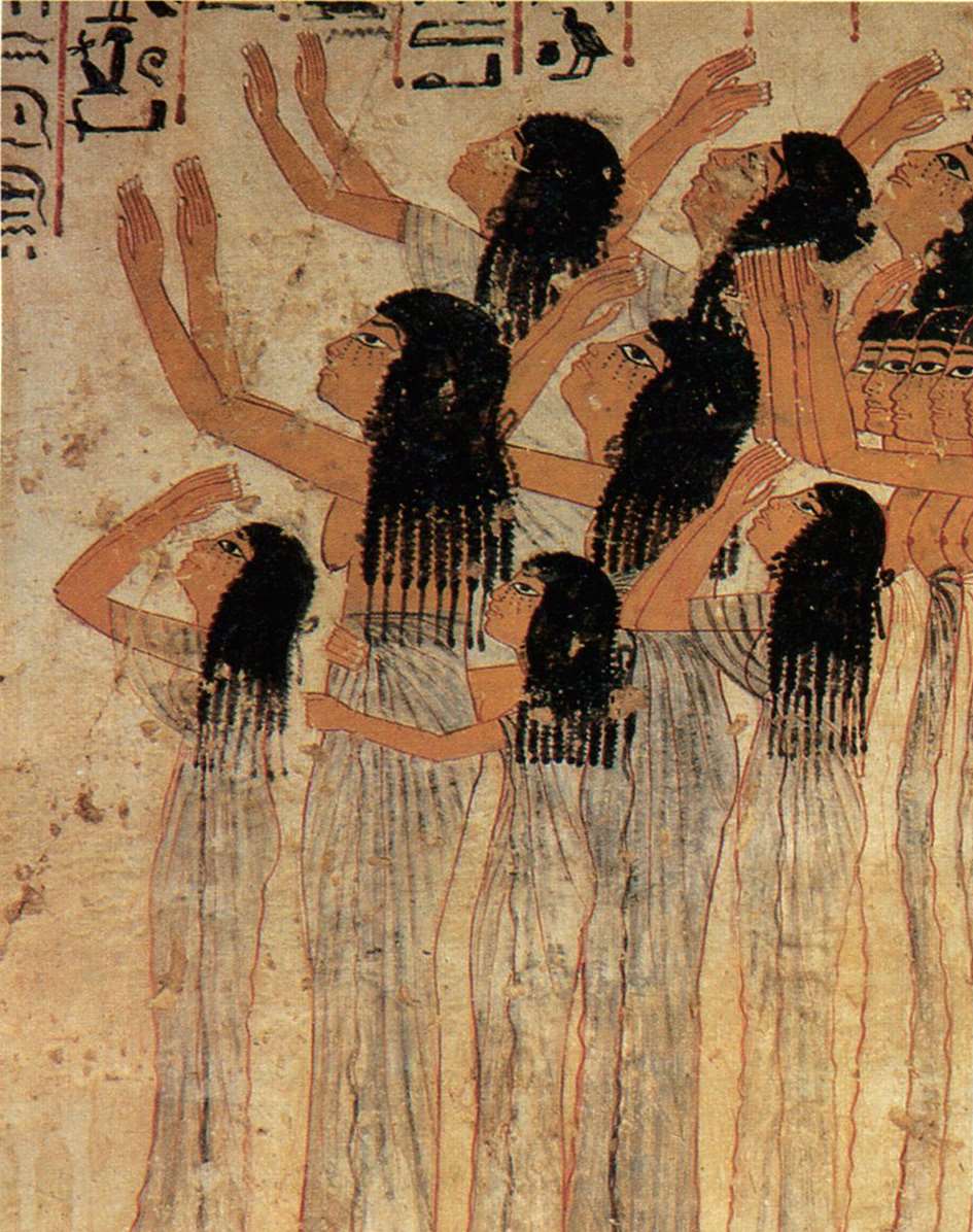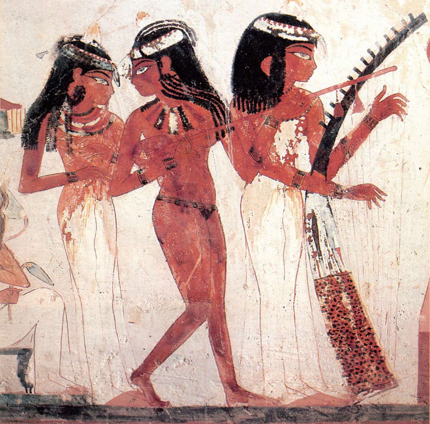 艺术所表现的一切场面都在争先恐后地为盛宴所需的祭品做象征性准备:死者可以取用食品以保证继续生活。这些场面如同连环画一样,按照合乎逻辑的秩序排列着。看画时要从下部看起,到上部结束。在一面表现农业劳动的墙壁上有:耕作、播种、收获、簸谷等。在另一面墙上,出现的是死者正在猎鸟和用渔叉在沼泽中捕鱼。在再现宴会的场面里,我们在各种不同组合的人物中,发现了这三位女乐师:一位在吹双笛,一位在奏诗琴,还有一位在弹竖琴。她们的头顶上都放着一个香奶角,宴会场面的所有参加者也都莫不如此。三个人的头都因姿势的不同和辫子的动态变化而显现出各自的表情。两位身着润湿长裙的姑娘衬出一位裸体舞女,她只在臀部戴了一条带子。一种惯例要求这些人物必须呈绝对正面律,即双肩为全正面,头为全侧,但眼为全正,骨盆为3/4侧面,下肢为全侧。为了表现出她的灵巧,舞女摆头向后看去,同时滑出轻快的舞步。