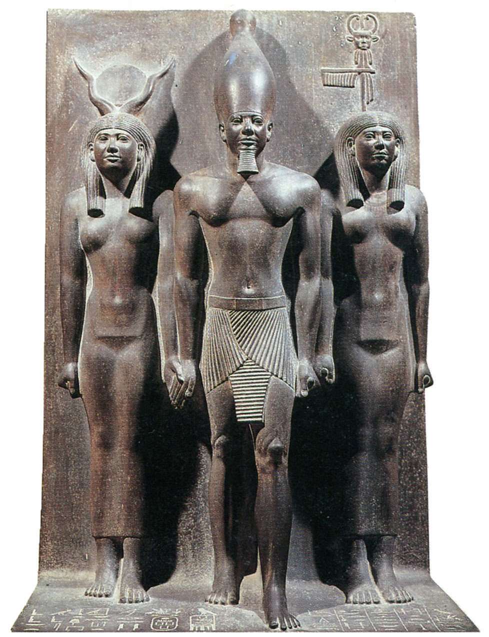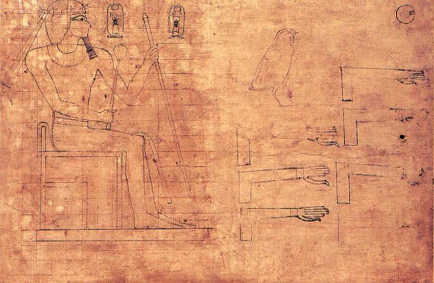 另外,还有一些地宫,即在岩壁上挖掘的地下墓室。中王国时,在底比斯西面国王谷中便有这样的建筑。在陵墓的墙壁上,王宫艺术工作室的画家、雕刻家们与牧师的宗教活动密切配合,用物质来实现法老的神奇力量,并保证他个人独有的永恒。一种一成不变的、使国王于死后仍在生活的程式赋予被画或被雕的人物以绝对的正面律和平板的庄严 * 。在浮雕上和绘画中,艺术家们让理想化的肖像待在神圣、高贵的姿态之中。人物是被画家从各种不同的视角上画出来的:一方面,骨盆和头部是正侧面的,另一方面,双目和双肩是全正面的。只是在新王国的坟墓中才表现出某种自发的自然主义来。