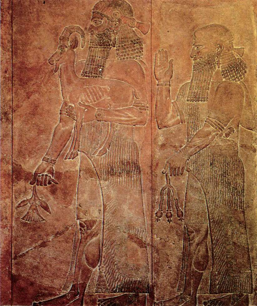 在美索不达米亚,苏美尔雕刻给人以硬直的静感。从数量巨大的男女神、祇国王显贵有时是普通百姓的雕像中散发出一种压迫感和恐惧感。“祈祷像”姶终是最具特点的雕刻种类。这种祈祷的人物把双手放在胸脯上,保持着固定的姿势。他的双目被夸张成大大的,用黑柏油画上了眼圈,似乎在望向视平线之外。雕像有时形成群组,使我们分辨不出哪是各路神仙,哪是凡夫俗子,哪是帝王,哪是侍从。在巴比伦人的王宫中,绘画描写了极其现实的场面,如国王穿衣的情景。亚述人则用雕刻来美化他们的宫殿。浮雕歌颂着国王的光荣,上面有巨大的、长着人脸的五足带翅公牛。国王的面孔蓄有很长的长方形胡须,呈有规律的卷起状。衣袍的做工非常精美。雕出的场面表现了宫廷生活(接待或致意)、打猎或战争。其真实感令人惊讶不已。我们在库尔萨巴德的萨尔贡二世宫殿浮雕 * 中可以看到这样的情景。
