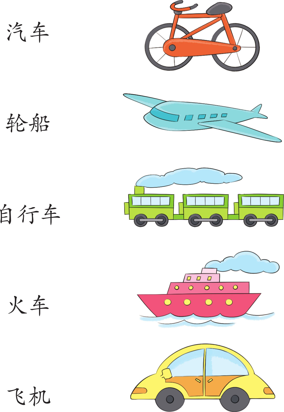 请将下面交通工具的名称与对应的图画连起来。妈妈还可以让孩子模仿一两种交通工具的声音。