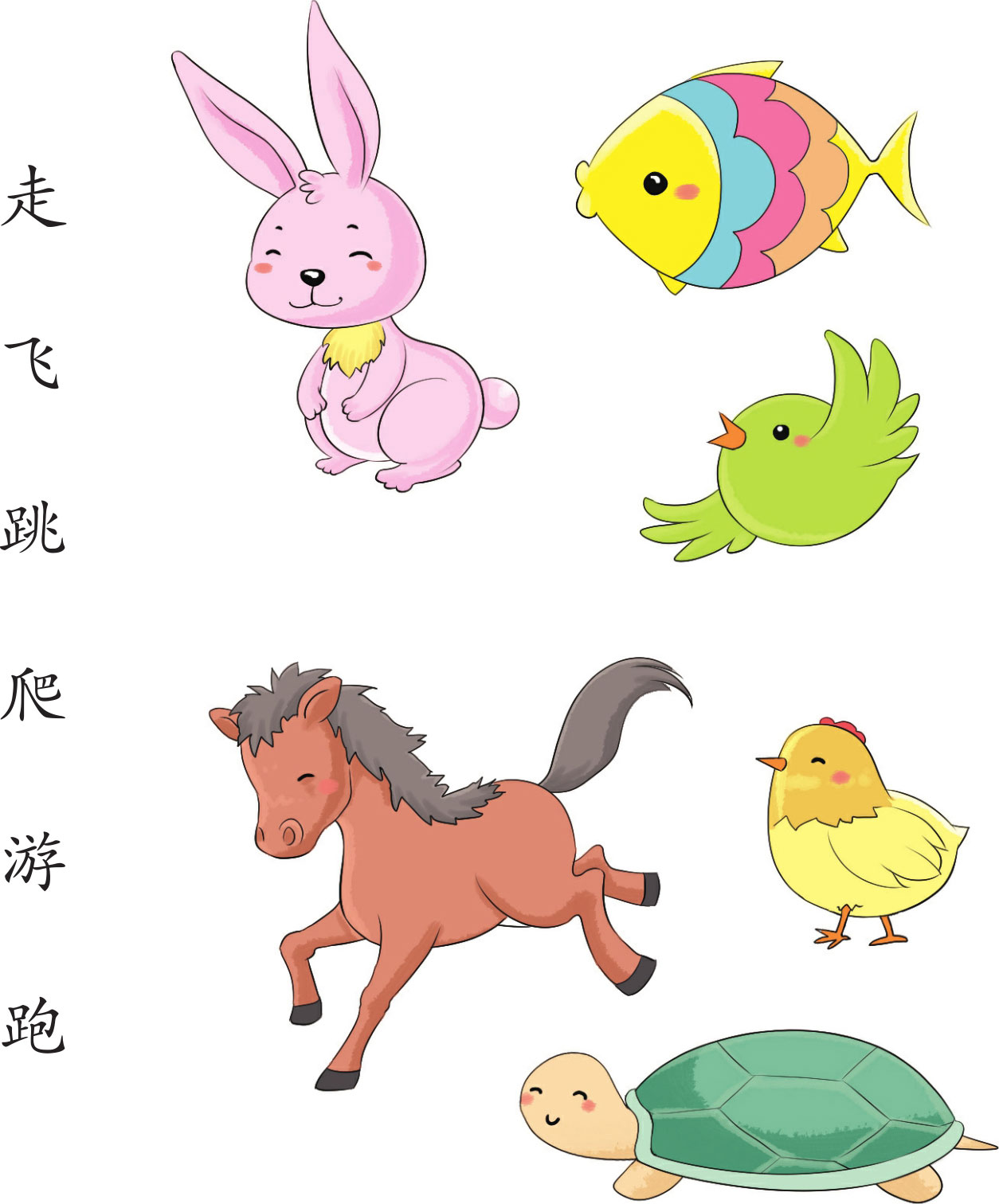 想一想,下面的动物在做什么?请把动物和相应动词连起来。