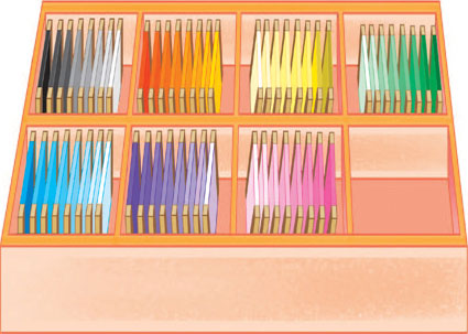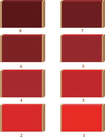 盒子外有8块颜色板,上面的颜色都是红色,但深浅度有所不同。给这些红色按照由浅到深的顺序排个序吧!