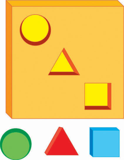 三角形、正方形和圆形的小木块应该放在木框架的哪个位置呢?试着用线把它们连起来吧!