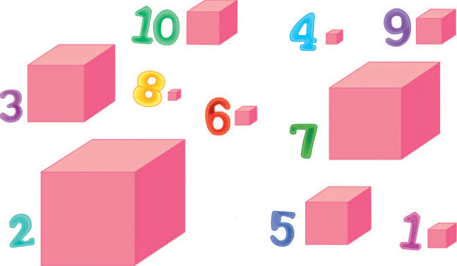 如果把下面10块玫瑰色的正方体木块按照由低到高越来越小的规律搭成玫瑰塔,它们应该如何排列呢?把正确排列的序号写下来。