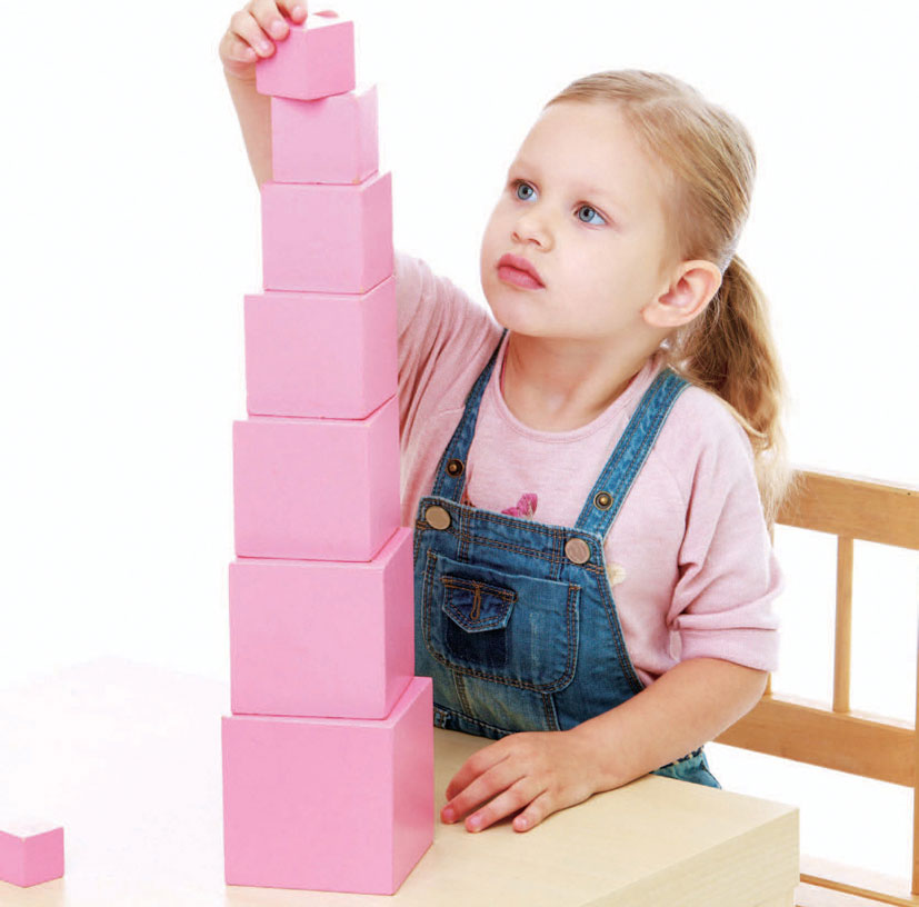 1.将所有的正方体打乱,然后让孩子按照从下到上、从大到小的顺序堆叠,直到他能堆成一座玫瑰色的塔为止。
