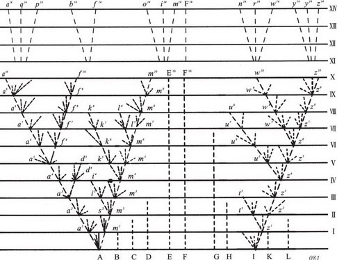 ●这里我们将标有数字的斜体字定义为属,从代表属的字母中分支出来的虚线表示该属下的不同物种。 这个图形中所画的属和种的数目之少,与 真实的自然界比起来无疑过于简化了,在此我们仅作为图例说明使用。