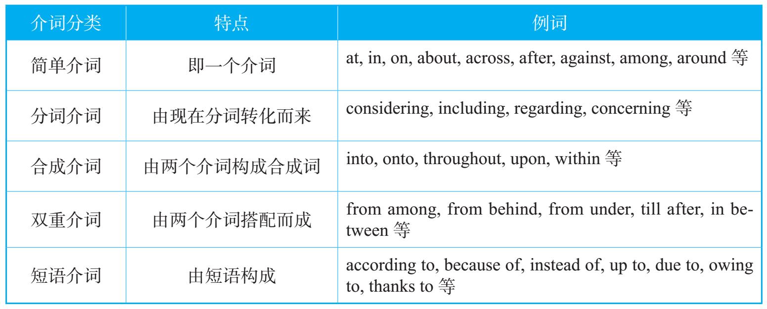 英语中,介词主要分为简单介词、分词介词、合成介词、双重介词、短语介词和兼类介词。