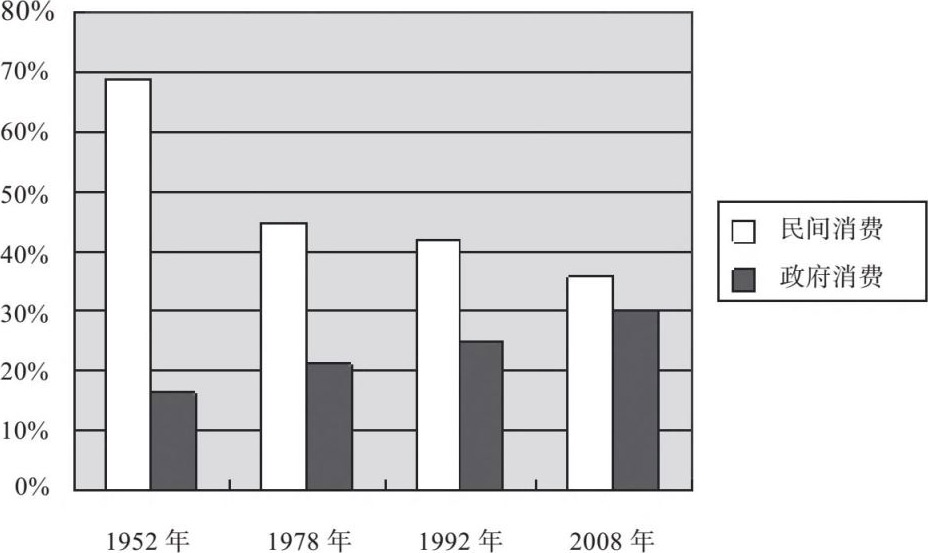 我可以给大家一些数字。我们把民间消费占GDP的百分比和政府消费占GDP的百分比当做两个指标来看,过去五十多年间,民间消费占GDP的比重有什么变化呢?1952年建国初期,民间消费占GDP的比重是69%;1978年改革开放初期,占到45%;改革开放第一期结束,即1992年邓小平南方讲话的时候,民间消费占GDP的42%;2008年则下降到35.5%。也就是说,民间消费占中国GDP的比重从1952年到现在总体上是直线下降的(见图一)。特别是在计划经济期间,从五十年代初到1978年,大幅度下滑。而政府消费从1952年占GDP的16.5%上升到现在差不多30%。两条曲线,民间消费直线下降,政府消费直线上升,为什么这两个趋势越来越强?