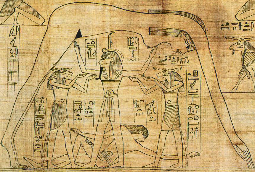 格林菲尔德纸草书上的古埃及宇宙结构图。天神努神(Nun)是围绕着宇宙的无尽之水的人格化,空气之神舒神(Shu)托着努神,而地神格布(Geb)躺在地上。纸草现藏于大英博物馆。
